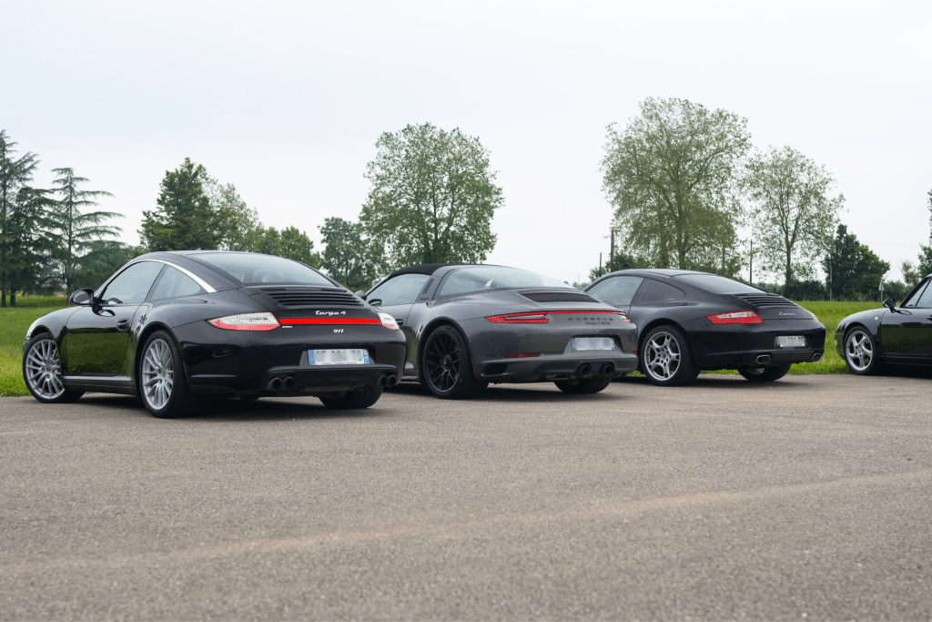 Sur le parking d’un hypermarché, à l’écart de toute vie active dominicale dans une ville où rien n’est ouvert le Jour du Seigneur, la voiture ouvreuse et la media car arrivent. Le drapeau hissé sur son mât indique le point de rendez-vous. Viennoiseries et cafés sont prêts à être dégustés avant de prendre la route : à chacun son remontant ! Les voitures, elles, préfèrent le sans-plomb. Tout est prêt pour accueillir les premiers arrivants qui ne tardent pas à arriver. Une Porsche Cayman GTS (Type 981) ouvre les hostilités. Son flat-6 ronronne doucement jusqu’à son stationnement juste devant nous. Je ne peux rester impassible devant une telle carrosserie, et pourtant il ne s’agit que d’une mise en bouche ! « Ça me change » lance le propriétaire, qui travaille… justement dans l’un des magasins du parking. Sauf que cette fois, nul besoin de conseiller des clients pas toujours amicaux. Ici, nous sommes là pour profiter. À peine le temps de penser ces mots qu’un autre carrosse débarque. Notre rendez-vous fait des jaloux, à tel point qu’un curieux a voulu se glisser dans le parking avec son Audi A3 TDI. Désolé, mais nous préférons nos bijoux ici présents. Ce n’était pas intentionnel, mais l’accent de toutes ces autos était très germanique, à prédominance Porschiste d’ailleurs. 991, 997, 993…