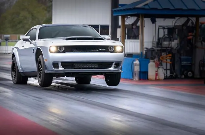 Pas suffisant disent les Américains. Avec de l’éthanol E85, la puissance dépasse le millier de chevaux pour atteindre 1025 équidés à 6.500 tours/minute et le couple disponible à 4.200 tours atteint 1281 nm ! De quoi ravager les pneumatiques, non ? Fort heureusement, ils ont été conçus sur mesure par un maître dans cet art, Mickey Thompson Tires. Cette officine se consacre depuis sa création en 1963 aux pneumatiques de voitures de dragster. Les records de vitesse c’est son dada. Les pneus avant mesurent 245mm de large, comme une simple Volkswagen Arteon, pour des jantes de 18 pouces. À l’arrière, la hausse est significative avec carrément 315mm pour des jantes de 17 pouces. Et sans surprise, la Demon 170 se cabre à l’accélération.