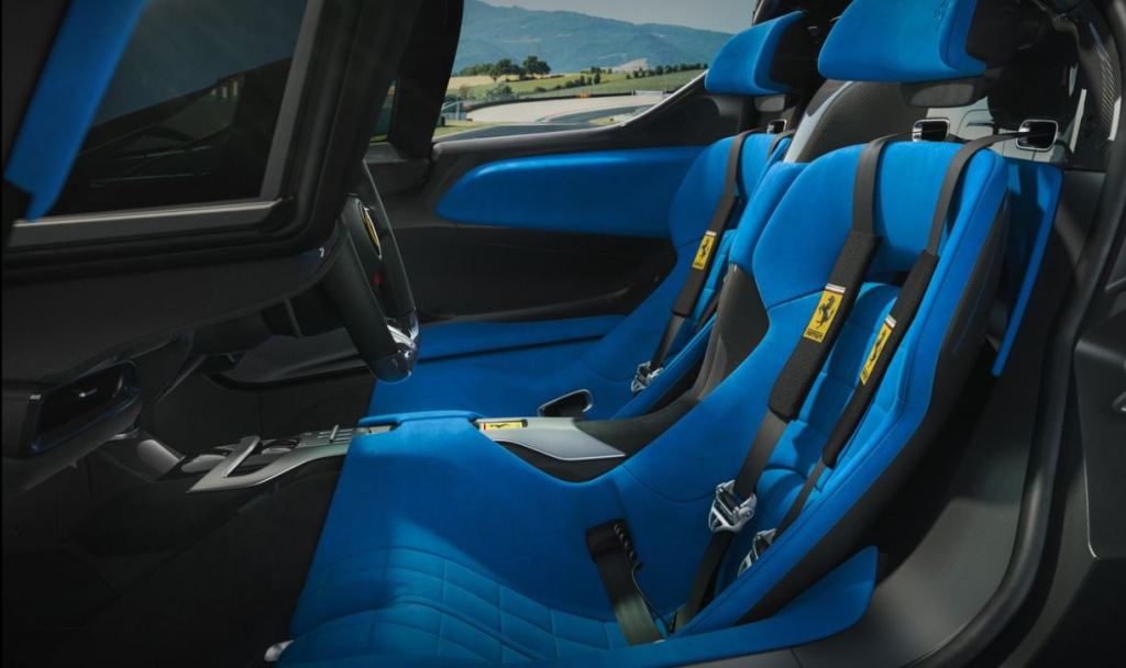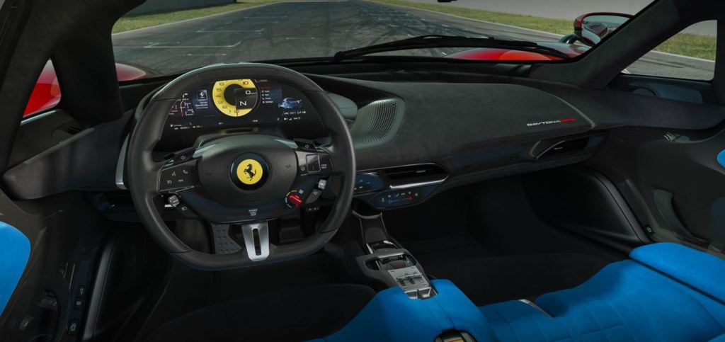 Comme l’Enzo et la LaFerrari, la Daytona SP3 accueille ses occupants grâce à des portières en élytre, celles-là même qui permettent un meilleur écoulement de l’air, du capot vers le profil. Sur le modèle présenté à la presse, les baquets se parent d’un bleu un peu velours, qui sent bon les années 60-70. Entre ces deux sièges, la grille en H est reprise de la SF90 Stradale. La place la plus prisée sera à coup sûr celle derrière le volant. Il comprend toujours plus de boutons pour que le conducteur/pilote ne lâche pas la jante lors des changements de mode de conduite. Derrière le volant, l’écran est toujours plus grand. Incliné comme il l’est, il inclut parfaitement le conducteur dans son environnement, de même que les commandes au centre de l’habitacle. Là, un bouton donne envie d’appuyer dessus. Pour le quidam qui ne s’y attend pas, et pour peu qu’il ne soit pas sourd, la pression sur ce bouton va le surprendre.