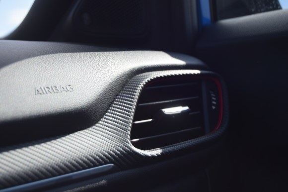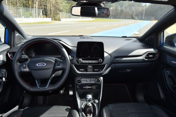 Retournons à l’intérieur, dans l’habitacle. L’accueil a fait un net progrès par rapport à celui d’une Ford d’il y a dix ans. Je me souviens des Fiesta qui avaient un tableau de bord plutôt imposant avec un écran tout petit et qui était plus proche du pare-brise que du conducteur. Certes, l’utilisation de plastique est visible mais ce n’est pas un véritable défaut à mon sens. Le client Ford n’est pas un client Rolls, il ne va pas chercher le zéro défaut de fabrication mais un rapport qualité/prix/encombrement/habitabilité optimal. Et cela change la donne. On voit le Puma d’un tout autre regard. Ainsi, si son écran n’est pas de toute première jeunesse ni d’une rapidité d’une tablette Tesla, il fait le job, et il le fait bien. Les coutures sont plutôt de bonne qualité. La finition de notre modèle d’essai est le ST Line, la finition intérieure et extérieure sportive, sans le caractère du vrai Puma ST, qui existe. Ainsi, finition sportive oblige, et comme c’est la mode aujourd’hui, la fibre de carbone s’invite à l’intérieur. Il entoure l’écran tactile, il court au-dessus de la boîte à gants, trouve un peu de place sur le volant. L’ambiance se veut sportive, mais sans excès, puisqu’il faut bien laisser le champ libre au ST, le vrai.