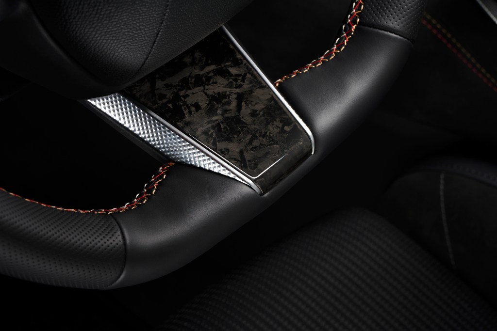 L’intérieur de cette finition Performance Line fait la part belle à la sportivité grâce à l’Alcantara et à l’insertion de décorations en carbone forgé, visible notamment sur le volant, une première sur un véhicule de grande série.