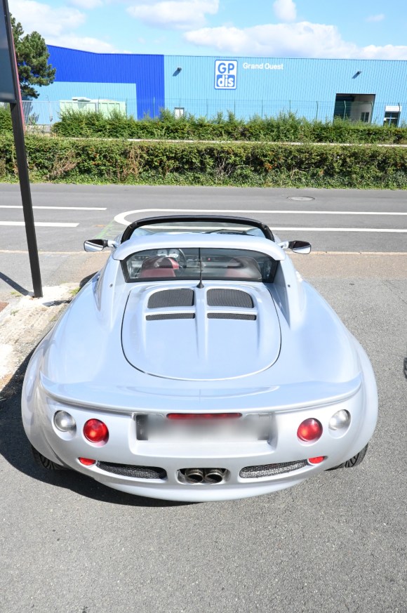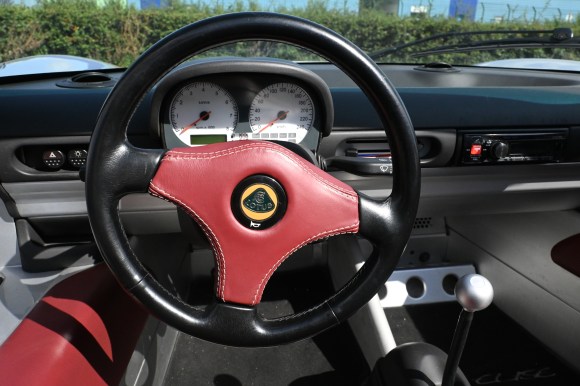 Comme la Maserati, elle prend de l’âge. Son regard avant surtout, avec ses phares ronds, trahit son design signé dans les années 90. Mais le reste de sa carrosserie, toute en courbes, fait d’elle une voiture intemporelle. A la recherche du poids le plus bas possible, l’Elise façonne sa carrosserie de pièces les plus grandes possibles pour ne pas avoir à ajouter trop d’attaches. Le moteur prend place à l’arrière, pour une meilleure répartition des masses. Relativement large et surtout courte, l’Elise n’attend qu’une chose : qu’on prenne son volant. L’entrée à son bord n’est pas chose aisée. Nous étions 4 jeunes cet après-midi-là. Etant le plus petit, je rentre plutôt facilement dedans. Le plus grand d’entre nous, lui, a autant de mal à rentrer qu’à sortir. Il faut toujours un plus petit que soi.