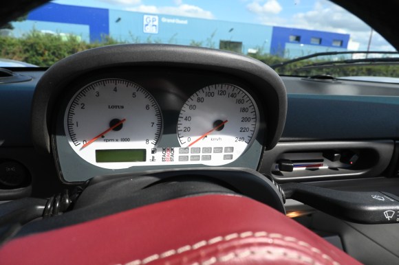 Par chance, pas de calage ni de fumée. Ouf ! La direction, même si non assistée, n’est pas si lourde que cela à la conduite. La route qui mène au garage est semée de bosses et d’irrégularités. Le moindre trou dans mon champ de vision se solde par une information remontée par la direction et par la voiture elle-même. Enfin, un virage, la direction est un bonheur à manipuler. La voiture n’étant pas outrancièrement large, il est facile de deviner son gabarit et de jouer avec. Pied dedans, le 4 cylindres de MG F monte dans les tours. Si une puissance de 140 chevaux vous semble faible, comparez-là au poids de la bête qui, ici, n’excède pas 750 kg en ordre de marche.