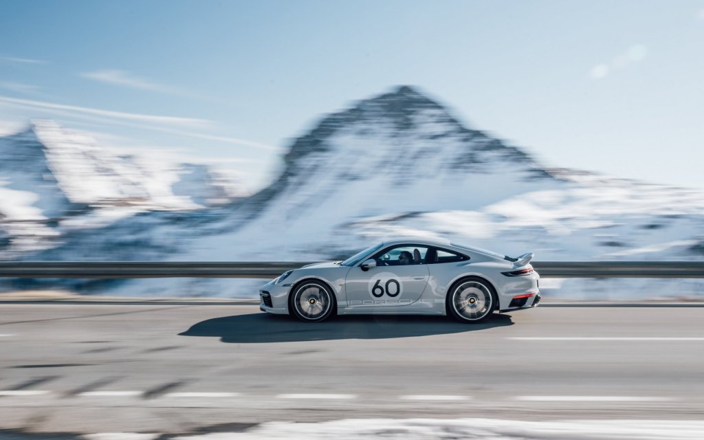 Mais il y a plusieurs soucis. Décrivons-là d’abord. Comme pour la 997 avant elle, les différences à l’avant sont ténues. Elle ressemble à s’y méprendre à une Porsche 992 Turbo classique. Or, elle est bien plus que ça. L’intérieur des phares est en noir, alors qu’ils sont couleur carrosserie normalement. Oui, ce n’est qu’un détail, difficilement visible. Alors, pour faciliter la distinction, Porsche rend hommage à la 2.7 RS en intégrant à nouveau un aileron « queue de canard ». Fabriqué en PRFC, plastique renforcé de fibres de carbone, il est dessiné de telle manière à refroidir le moteur. Car la 992 Sport Classic en a besoin de refroidissement. Non pas qu’elle soit surpuissante – encore que… – mais c’est surtout qu’elle se base sur la 992 Turbo S, mais que pour des raisons esthétiques, elle retire les entrées d’air latérales. La pureté y gagne, mais les ingénieurs ont dû se faire des cheveux blancs pour compenser cette perte d’apport en air… De profil, cet aileron inédit donne une impression de dynamisme, même à l’arrêt. Afin de rendre la Sport Classic unique dans la gamme, Porsche a dessiné de nouvelles jantes, mais de mêmes tailles que les Turbo, des stickers numérotés de 1 à 99 et conçu une nouvelle couleur. En référence à la 356 Speedster, la Sport Classic peut arborer une teinte baptisée Sport Grey Metallic. 3 autres peintures sont disponibles en option.