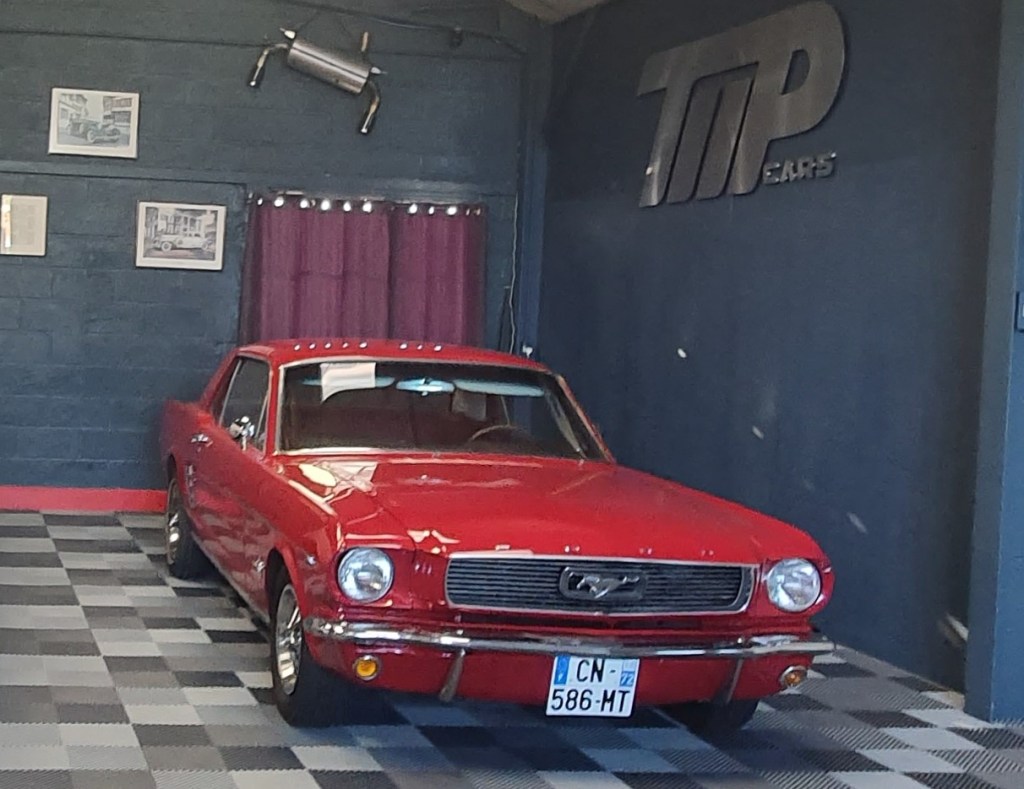 Dans l’atelier, la doyenne du garage dort paisiblement. Il s’agit d’une Américaine. Véritable symbole de l’Amérique, de la ruée vers l’or, la Ford Mustang est une icône. Le modèle ici présent est un modèle 65. Un coupé, pas un fastback, doté d’un V8 à l’avant. Sa couleur, rouge, est la plus originale du plateau. Lors de notre première venue, elle était garée à côté de la Lotus. Autant dire que l’Anglaise avait l’air d’être un jouet à côté de la Mustang.