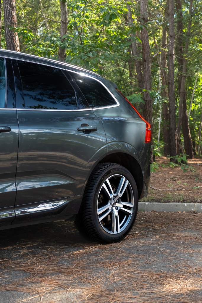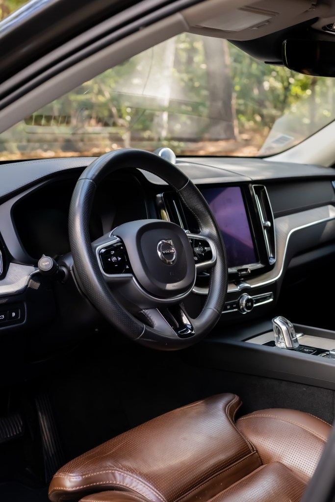 La raison de sa réussite s’explique facilement : le XC60 mélange les atouts d’un monospace avec celui d’une berline. On pourrait me répondre que c’est la définition même d’un SUV. C’est tout à fait ça. Le plaisir de conduite d’un véhicule bas avec l’habitabilité d’un mono volume. Le XC60 choisit de parler à la famille plutôt qu’à son conducteur, de son design à son ressenti de conduite. De l’extérieur, même si ses dimensions froides effraient, avec 1,9 m de large pour 4,69 m de long, la deuxième génération du SUV suédois rassure un peu par la douceur de ses lignes. La douceur, un mot qui définit parfaitement ce modèle, comme nous le verrons plus tard. Revenons au design, et à son identité stylistique qui passe par sa calandre proéminente soulignée de chrome et où se rejoignent les phares. Ces derniers reprennent la forme du marteau de Thor en guise de signature lumineuse, immédiatement reconnaissable. Cette identité lumineuse concerne également la face arrière, avec des feux qui descendent le long du coffre. De profil, le XC60 comprend un long capot et un habitacle rejeté vers l’arrière. Il apparaît d’ailleurs davantage comme un break surélevé qu’un SUV comme on l’entend aujourd’hui… Et préfère le terme d’Utility que de Sport du patronyme de son segment.
