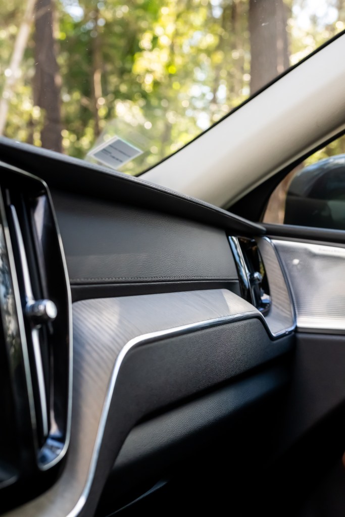 Un segment fortement représenté en Allemagne. Le trio premium représente l’objectif de toutes les marques. Le XC60 avance, en plus des arguments stylistiques, un habitacle bien différent de ses concurrents. Il comporte, comme 99% de la production automobile actuelle, un écran derrière le volant et un autre au centre. Le XC60 dispose d’un écran central vertical d’une taille amplement suffisante. Il intègre le système de navigation signé Google, avec Google Maps et la reconnaissance vocale. Mais plus que les écrans, que l’on retrouve dans toutes les autos d’aujourd’hui, les Volvo épatent par leur habitacle et le soin apporté. De l’épaisseur du cuir du tableau de bord aux poignées de portes très rigides, tout est bien pensé et respire le monde du premium. La couleur de la sellerie assombrit l’habitacle, mais il suffit d’une pression sur le bouton du toit pour que le volet s’ouvre et laisse apparaître le toit panoramique. Une seconde impulsion et la vitre s’ouvre, pour mieux respirer. Aérateurs élégants, placage bois rugueux – du plus bel effet – et barre d’aluminium qui souligne ce placage subliment un habitacle tiré à quatre épingle. Fier de son pays d’origine, l’habitacle reçoit le drapeau suédois directement sur cette barre d’aluminium, d’une élégance extrême. Les passagers arrière ne sont pas laissés pour compte, avec un bel espace à bord. Le siège central se transforme en trappe à ski ou en accoudoir. Dans ce dernier cas, il dispose de deux portes-gobelets et d’un rangement, idéal pour cacher le goûter des enfants !